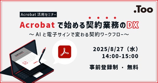 クリエイティブ市場の総合商社・株式会社Too(本社/東京都港区虎ノ門3-4-7、社長/石井剛太、以下Too)は、 オンラインセミナー「Acrobatで始める契約業務のDX ~ AIと電子サインで変わる契約ワークフロー」を2025年8月27日(水)に開催します。