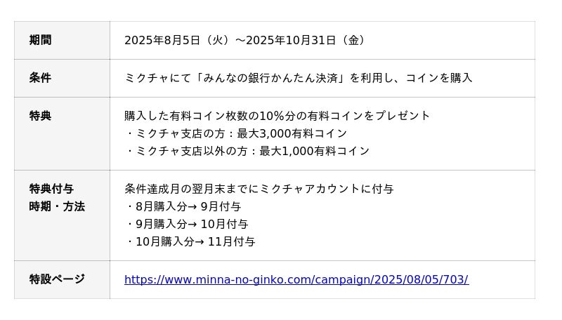 口座直結型の即時決済サービス「みんなの銀行かんたん決済」の提供開始を記念して、「ミクチャをもっと楽しもう!みんなの銀行かんたん決済記念キャンペーン」を実施します。詳細は特設ページをご覧ください。