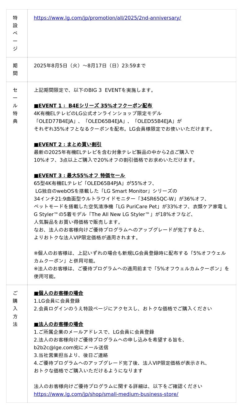 この機会にぜひ、LG公式オンラインショップ内『2nd Anniversary BIG 3 EVENTS』の特設ページ(URL:https://www.lg.com/jp/promotion/all/2025/2nd-anniversary/)ならびに法人のお客様向けご優待プログラムの詳細(https://www.lg.com/jp/shop/small-medium-business-store/)をご確認ください。