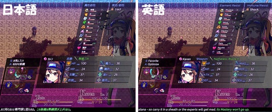 本作はゲーム中 @キー/L3ボタン(キーコンフィグ可)でいつでも即座に日本語・英語の切り替えと対訳表示が可能です。
