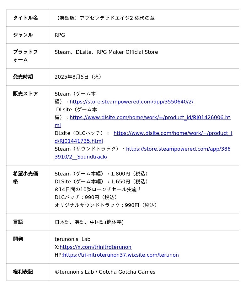この度、株式会社KADOKAWAのグループ会社である株式会社Gotcha Gotcha Games(本社:東京都千代田区、代表取締役社長:成田聖)より、2025年8月5日(火)に、ミックスジャンル型RPG『【英語版】アブセンテッドエイジ2 依代の章』をSteam、DLsiteにて発売を開始します。