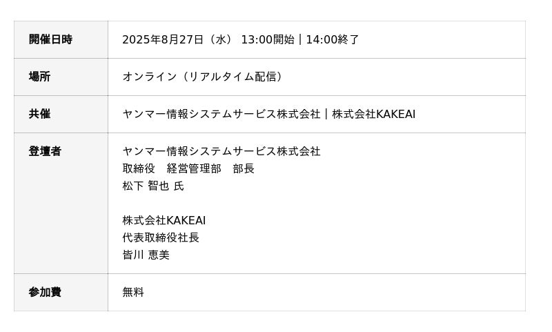 株式会社KAKEAI、「1on1が変える上司・部下のコミュニケーション」をテーマに、ヤンマー情報システムサービスの1on1実践知がわかるオンラインセミナーを8月27日(水)に開催