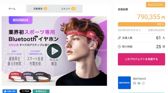 【初日で目標金額達成】WAGAWAGA Champion 次世代のスポーツ専用イヤホンが運動体験を革新。想定を超える反響に感謝。