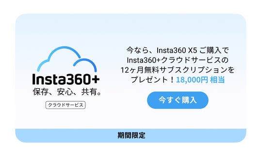 また、期間限定で、購入者には1年間無料の※Insta360+(1TBクラウドストレージ)が付属します。 ※詳細はInsta360アプリ内の利用規約をご確認ください。