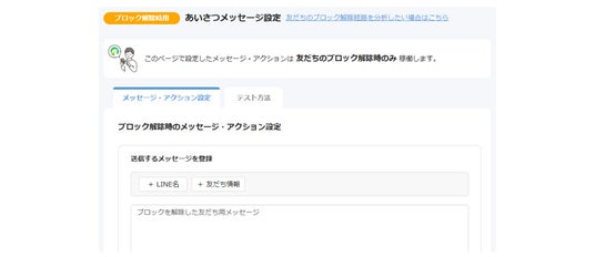 これにより、ユーザーがLINE公式アカウントのブロックを解除した瞬間に、あらかじめ設定したメッセージやアクションを自動送信できるようになり、再エンゲージメントをスムーズに行えます。