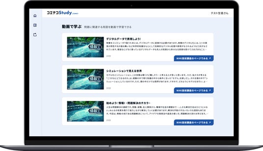 「コエテコStudy byGMO」は、NHK高校講座とのAPI連携により「情報I」動画コンテンツへのアクセス機能の提供を開始しました。生徒は、演習問題に解答した後、関連する解説動画も簡単に視聴できるようになり、問題演習と視覚的学習を組み合わせることで、学習内容の理解をより一層深めることが可能になりました。本機能は、2025年7月上旬よりすべてのユーザーに提供を開始しています。
