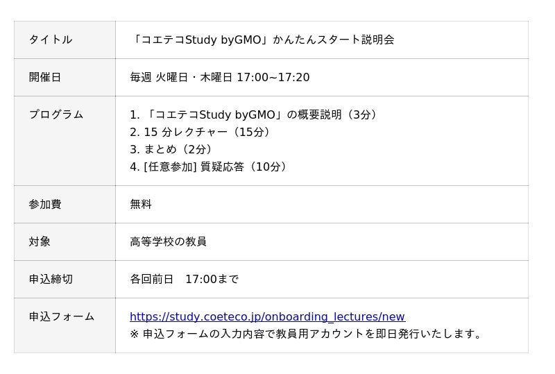 「コエテコStudy byGMO」に関する説明会を定期開催しております。教員の方は、授業の合間などにぜひご参加ください。