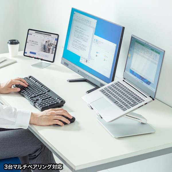 すべてのモデルは、キートップの印字に耐久性のあるレーザー刻印を採用しているため、文字が消えにくく長期間使用できるという。また、キーボードの角度を調整可能なスタンドが付属しており、タイピングをより快適に行うことができる。さらに、充電不要の電池式であるため、電池を入れ替えるだけですぐに使用できるのもポイントだ。