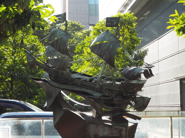 よく見ると、なかなか立派な帆船の彫刻です。名前は「デ・リーフデ号像」というそうで、昔のオランダの船なのだとか。正確な大きさはわからなかったのですが、身長156cmの私がちょっと見上げて視界に納まるくらいの高さ。こんな像があったなんて、今まで全く気づきませんでした!