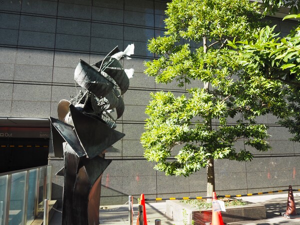 JR東京駅丸の内駅舎の目の前に立つ「丸の内ビルディング」。通称”丸ビル”の名で親しまれる「丸の内ビルディング」のすぐ南側に、とある像を発見しました。といっても、木々に囲まれた自転車置き場の一角にひっそりと置かれていて、全く人目に付かない…。私もうっかり通り過ぎてしまったのですが、「あれ、なんか立ってた⁉」と思って引き返したほどです(笑)。