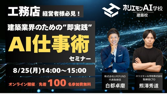 建築業界に特化したフランチャイズ校『ホリエモンAI学校 建築校』を新たに開校。建築業界のための”即実践”AI仕事術セミナーを8月25日開催。