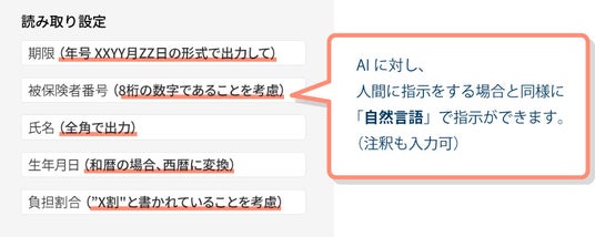 インテリジェント・リード(TM)は、帳票からの文字抽出において、項目ごとに自然言語による注釈や指令文を設定できる革新的な技術です。従来のOCRでは機械的な文字認識に留まっていましたが、本技術により、AIが人間の指示を理解し、文脈に応じた高度な抽出・変換処理が可能となりました。