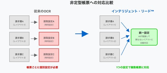 - ひとつの読み取り設定で複数種類の非定型帳票が読み取り可能に。従来のOCRでは、1つの帳票に対して1つの読み取り設定が必要で、レイアウトが異なる帳票ごとに個別設定が必須でした。インテリジェント・リード(TM)では、AIの推論能力を活用することで、1つの設定で複数の異なる帳票に対応可能となり、設定工数を大幅に削減します。