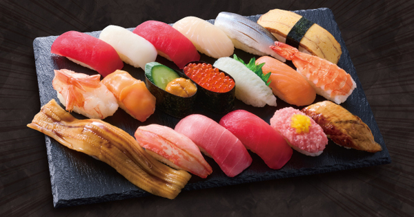 上ネタ・人気ネタなど19貫入ったプレミアムなセット。ネタは、まぐろ、えんがわ、いか、サーモン、バサ、えび、こはだ、一本穴子、玉子、本ずわいがに、生えび、本まぐろ中とろ、赤貝、とろたく、うに胡瓜軍艦、うなぎ、いくら軍艦。