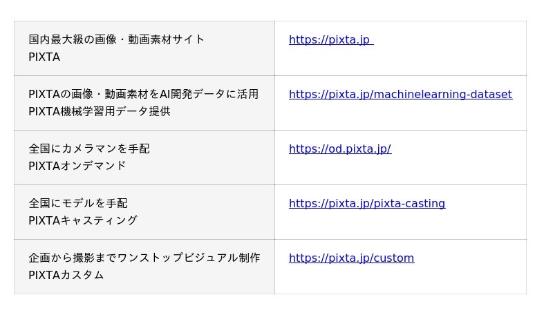 事業内容:デジタル素材のオンラインマーケットプレイス「PIXTA」の運営、法人向け出張撮影・カメラマンサービス「PIXTAオンデマンド」の運営、出張撮影プラットフォーム「fotowa」の運営