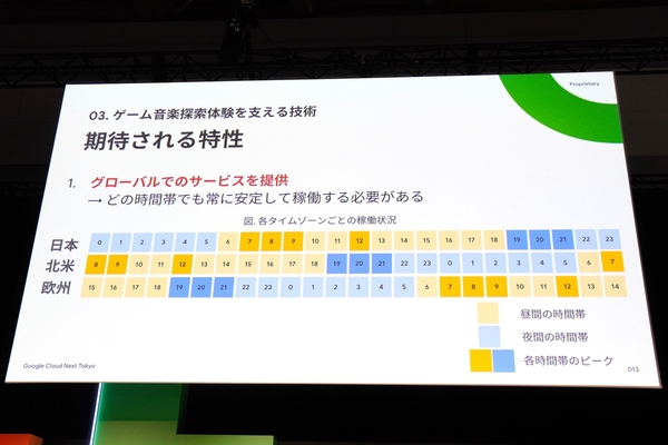 APIの提供では、3つの技術特性を重視している。ひとつ目は「常時安定した稼働」だ。Nintendo Musicは、40を超える国や地域で配信されているため、ユーザーのタイムゾーンはバラバラだ。ピーク時間帯は「通勤通学時間」や「お昼休み時間」だが、常にどこかの地域でピーク時間帯を迎えることになるため、常に安定したサービス提供を維持する必要がある。
