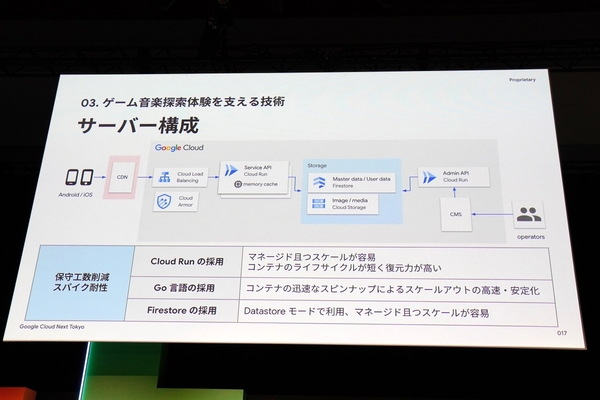 保守工数削減やスパイク(アクセスの急増)対応の観点では、Cloud Runに加え、開発言語に「Go」を採用して、コンテナの迅速なスピンアップによるスケールの高速・安定化を図っている。また、永続層(データベース)には、マネージドかつスケールが容易なサーバーレスのNoSQLデータベース「Firestore」をDatastoreモード(従来のDatastoreと同様の動作をするモード)で利用している。