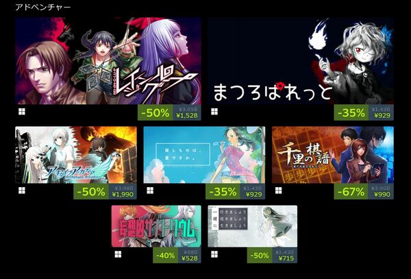最大67%オフで、多くのタイトルが50%オフとなる本セール。1000円以下で廉価ながら遊び応えのあるRPG・アドベンチャーゲームが多数なので、要チェックだ。