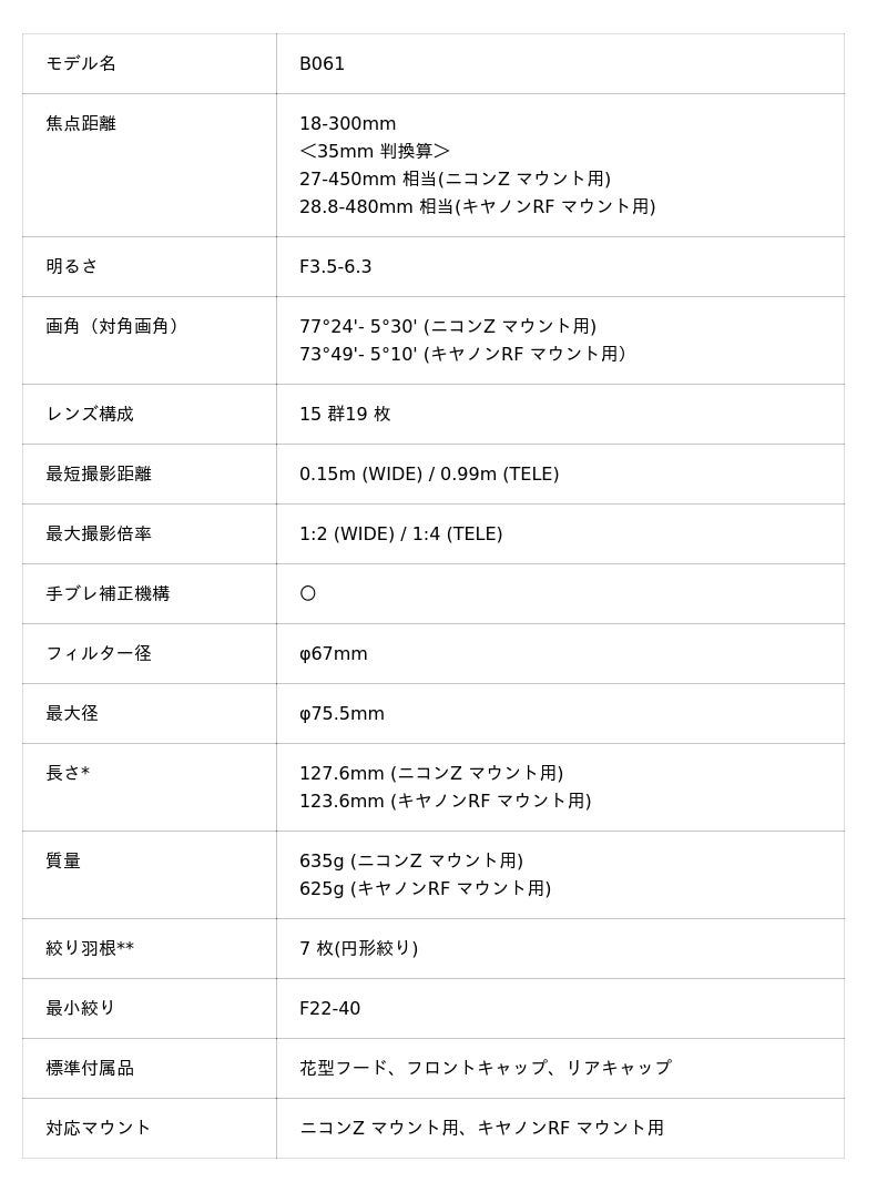 総合光学機器メーカーの株式会社タムロン(代表取締役社長:桜庭省吾、本社:さいたま市)は、APS-Cミラーレス一眼カメラ対応の高倍率ズームレンズ「18-300mm F/3.5-6.3 Di III-A*1 VC VXD (Model B061)」(以下18-300mm F3.5-6.3)のニコン Z マウント用を2025年8月28日、キヤノンRFマウント用を2025年9月26日に発売します。