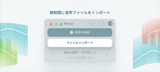 これまでのリアルタイム録音に加え、音声ファイルを無制限に取り込み、文字起こしが可能になりました。