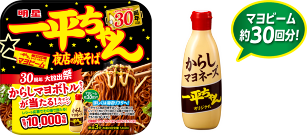 およそ30回分の“マヨビーム”ができる「からしマヨボトル」240gと、「一平ちゃん夜店の焼そば」3食をセットにした「からしマヨボトルセット」が当たるキャンペーンで、当選者数は1万人です。