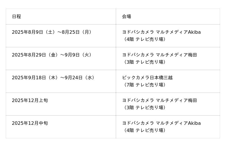第一弾のヨドバシカメラ マルチメディアAkibaを皮切りに、首都圏および関西エリアの家電量販店での開催を予定しており、実施スケジュールは以下の通りです。今後の決定情報は、随時LG公式ホームページおよび公式SNSにてお知らせします。