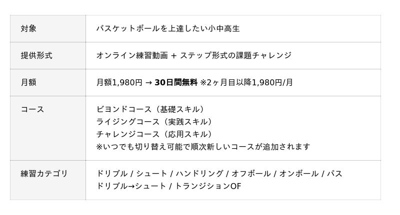ドリブル・ハンドリングなどの基礎技術を体系的に学べるプログラムや高難度の上級スキルまで、1人ひとりのレベルやペースに合わせて反復しながら着実にスキルアップできるサービスです。