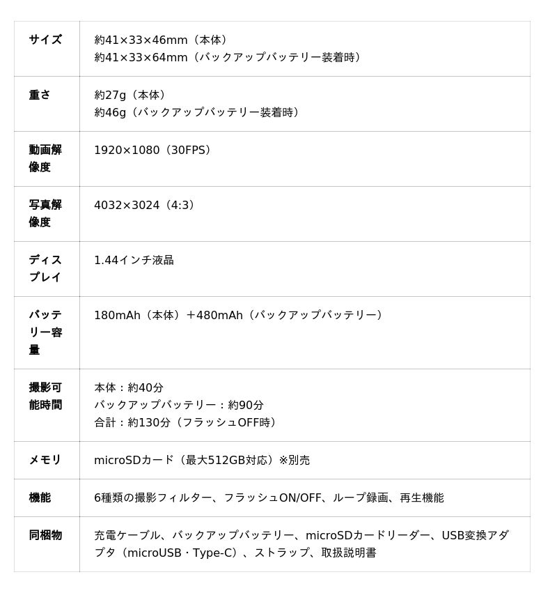 これだけの時間があれば、一日中遊んで回る時の記録も十分に賄えます。充電は付属のケーブルで簡単にできるので、気にせず使えます。
