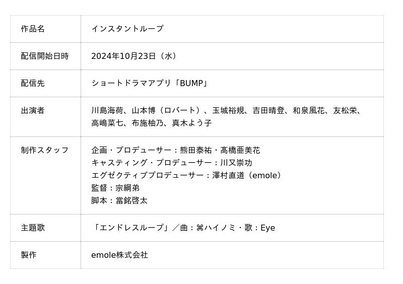 ショートドラマ配信アプリ「BUMP」を提供するemole株式会社(本社:東京都目黒区、代表取締役:澤村直道)は、2025年8月より、日本航空株式会社(以下、JAL)の国内線・国際線(※1)の機内エンターテインメントにて、BUMPオリジナルショートドラマ作品『インスタントループ』の上映を開始いたします。