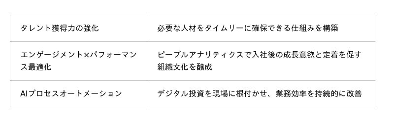 本統合により、AIを核にしたタレントインテリジェンス※ を活用しながら、HC(Human Capital)領域の採用・育成・定着を一気通貫で支援するワンストップ体制を確立し、中堅・中小企業の持続的成長を後押しします