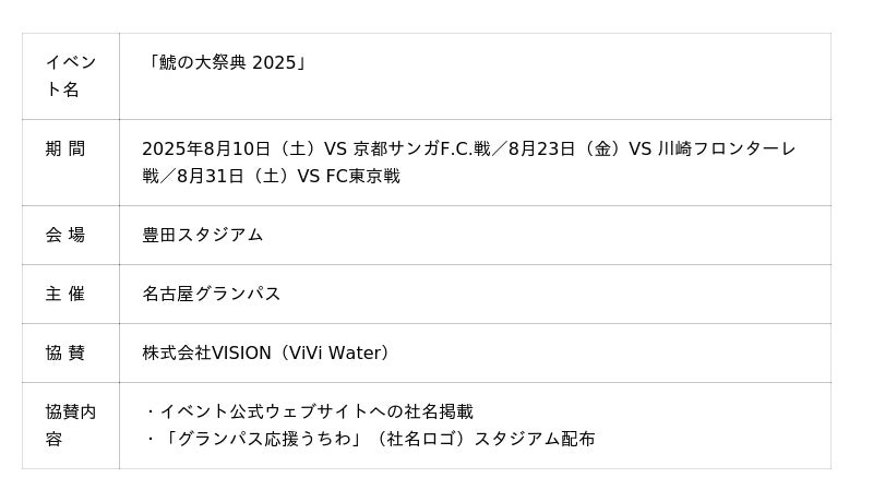 株式会社VISION(本社:愛知県名古屋市中区栄、代表取締役社長 鈴木浩司)は、明治安田生命J1リーグ所属の名古屋グランパスが主催する夏の一大イベント「鯱の大祭典 2025」に協賛いたします。本協賛を通じ、当社はViVi Waterブランドを通じた「清潔な水」と「健やかな暮らし」を地域の皆さまへお届けするとともに、地元への貢献を心から大切にしてまいります。