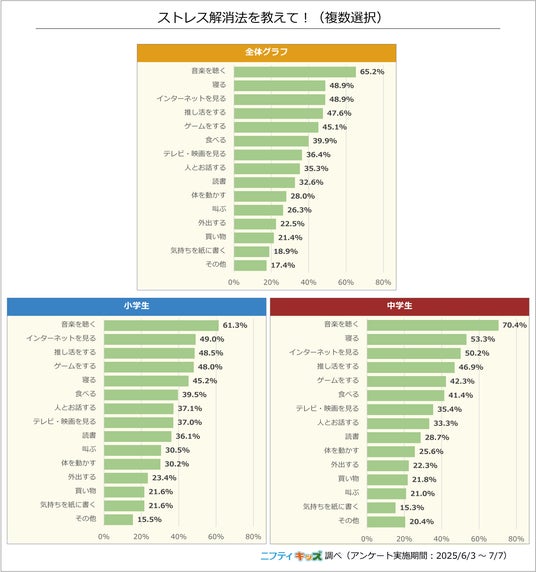 小学生・中学生ともに、「音楽を聴く」が1位でした。また「体を動かす」「外出する」といった選択肢よりも、「寝る」「インターネットを見る」「ゲームをする」などの屋内でできる方法が上位を占めました。
