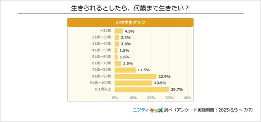 「101歳以上」と回答した人が最も多く、29.7%でした。「81歳~90歳」「91歳~100歳」の選択肢にも合わせて40%以上の票が集まり、長生きを望む子どもたちが多いとわかりました。
