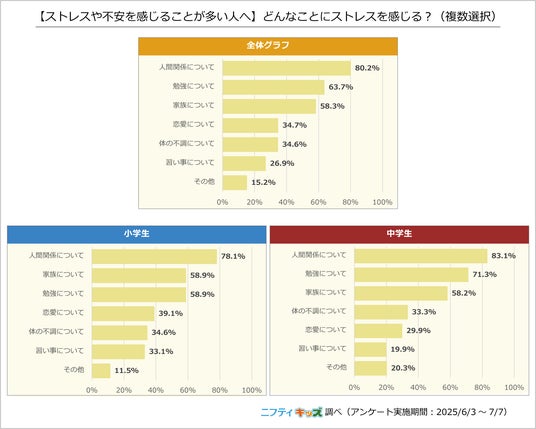 「人間関係について」が最多で、小学生では78.1%、中学生では83.1%が回答しました。「勉強について」「家族について」も上位でした。