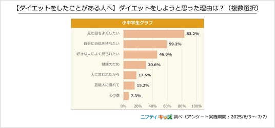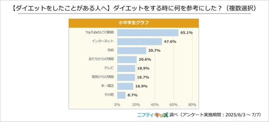 また、小中学生の中でダイエットをしたいと思ったことがある人の割合は66.5%でした。ダイエット方法としては、「運動をする」や「筋トレをする」など体を動かす方法が人気でした。