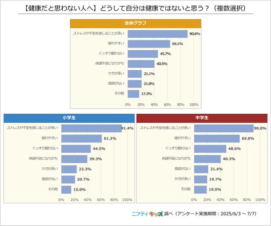 最も多く選ばれた選択肢は「ストレスや不安を感じることが多い」でした。小学生・中学生ともに、日頃の心理的な負担が健康にも影響すると感じていることがわかります。