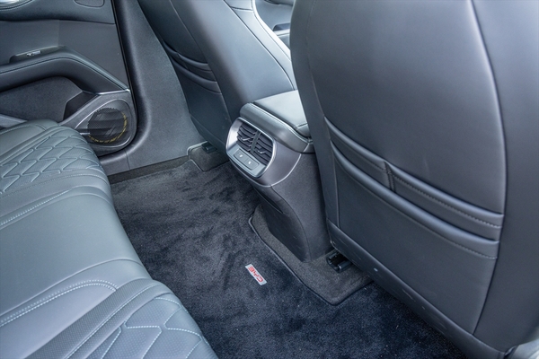 後席ドアを開けると革張りの上質な室内が拡がっていた。フラットな床面は電気自動車ならでは。ちなみに床下にはBYDのお家芸である、リン酸鉄リチウムイオンによるブレードバッテリー(総電力量82.56kWh)が敷き詰められている。