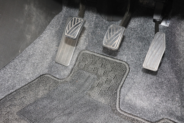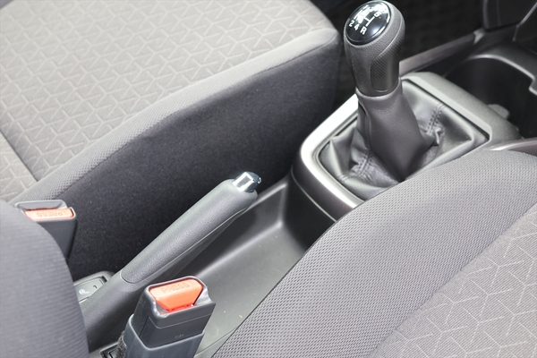 コクピットは、他モデルとほぼ同じ。最上位「ハイブリッドMZ」の電動パーキングブレーキが採用されないかわりに、安定のハンドタイプのサイドブレーキを装備。さらに5速のMTシフトレバーに加え、足元にはクラッチも合わせた3ペダルを装備します。