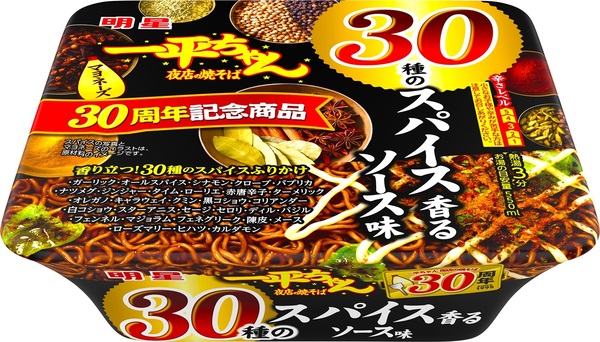 「明星 一平ちゃん夜店の焼そば」は“からしマヨネーズ付きカップ焼そば”という切り口のヤップ焼そばとして1995年に初登場しました。30周年を迎えた今年は、記念商品として「明星 一平ちゃん夜店の焼そば ショートケーキ味」を2月に発売。今回は第2弾として、30周年にちなんで「30」種のスパイスを効かせ焼そばです。