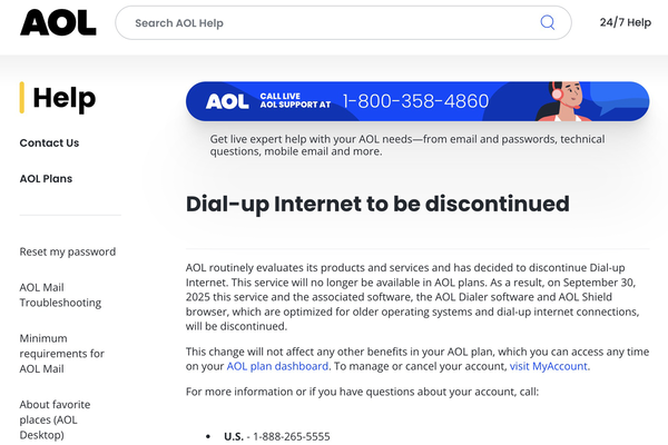 なお、今回の変更はダイヤルアップサービスに関連するものに限定される。その他のAOLプランに含まれる特典に影響はなく、ユーザーは引き続き「AOL plan dashboard」からアクセス可能。アカウントの管理やキャンセルは「MyAccount」にて対応している。