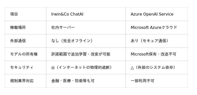 Azure OpenAI Service は、Microsoftのクラウド環境でGPT-4o等のモデルを利用する法人向けサービスです。セキュリティは高いものの、必ずインターネット経由でクラウドと通信し、モデル本体はMicrosoftが保有しています。
