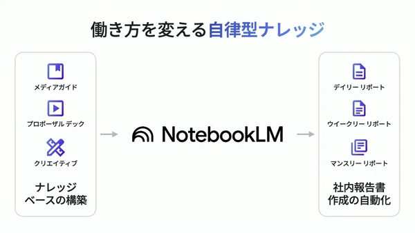新しい働き方を象徴するのが、NotebookLMの活用だ。チーム特有の情報を同サービスに集約することで、機動的なチーム編成が可能になり、提出先が異なる報告書の作成も自動化される。