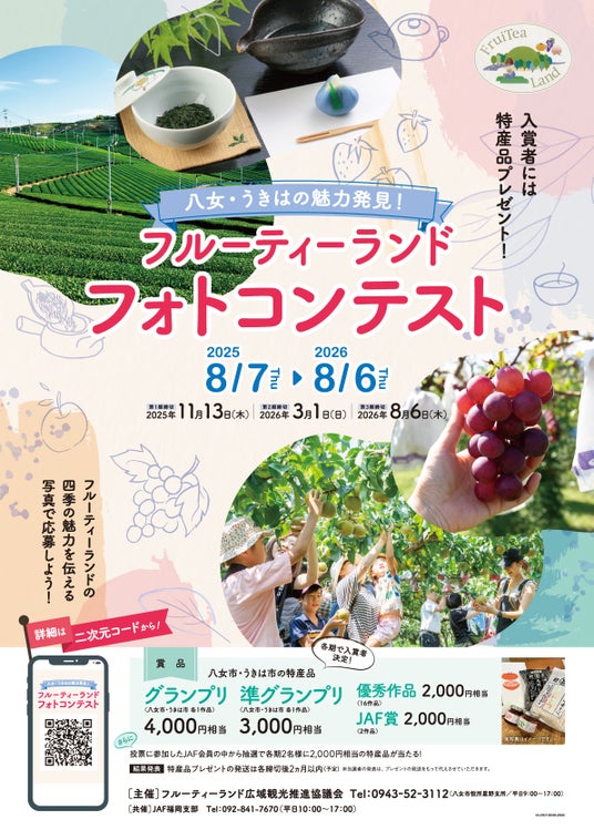 今回のフォトコンテストはどなたでも応募可能で、フルーティーランドの四季折々の風景や観光スポットをテーマにした写真を募集します。各期審査をおこない、入賞者には八女市・うきは市の特産品をプレゼントします。さらに、JAF賞(※1)の設置や、JAF会員によるウェブ投票も実施し、投票に参加した会員の中から抽選で特産品が当たるチャンスもあります。