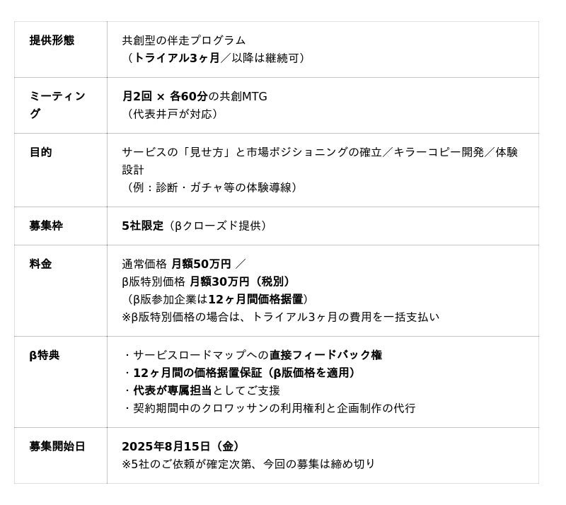 期間は3ヶ月固定、定例の共創ミーティング(月2回 × 各60分)で、キラーコピーや体験設計まで一気通貫で磨き上げます。β版参加企業には、サービスロードマップへの直接フィードバック権、継続希望の際の12ヶ月の価格据置保証、代表の井戸が専属担当として支援をいたします。通常価格は月額50万円で提供を予定しておりますが、β版特別価格として月額30万円(税別)にて、トライアル(3ヶ月)として提供します。