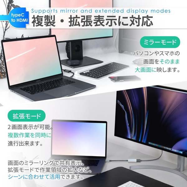 「ミラーモード」と「拡張モード」の2つの画面表示モードを持ち、プレゼンや動画視聴、デュアルモニター作業といったさまざまなシーンでの利用が可能。挿すだけで使えるので、面倒なドライバのインストールが不要であるという利便性も見逃せない。