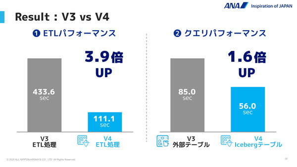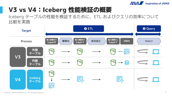 そこでANAでは2025年、多数のParquetファイルを管理するためのメタデータフォーマットとして「Apache Iceberg」を採用する方針を固め、BlueLake V4のPoCを開始した。