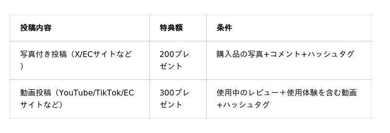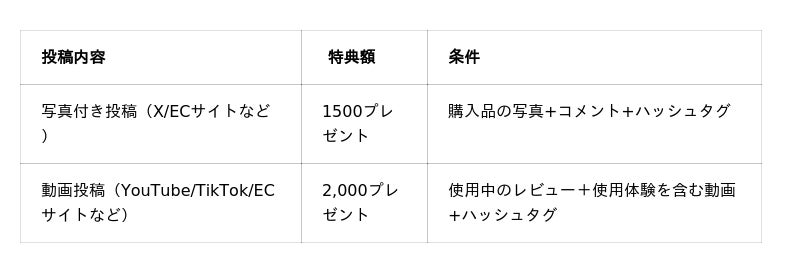対象モニターを購入し、X(Twitter)、YouTubeなどのSNSとネットショッピングサイトで製品レビュー投稿をしてくれた方に、最大2,000ポイントのえらべるPayをプレゼント。