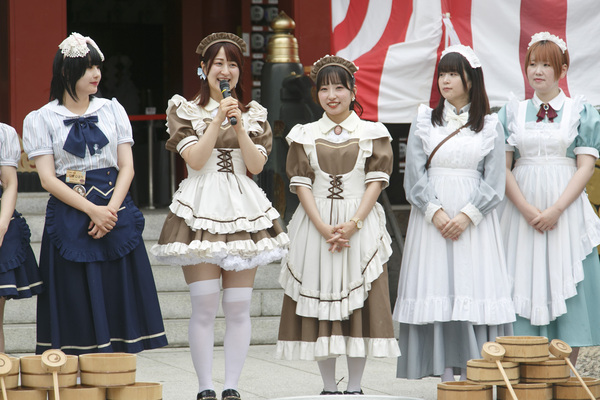開始時刻の10時になると、神田明神の社殿前にメイドさんたちが登場。今年参加したメイドさんは、秋葉原近辺に店舗を構える17店。朝早くから神田明神境内で待機していた大勢のファンは、メイドさんたちを拍手で迎えた。