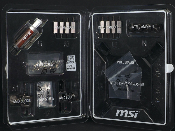 これらアクセサリーだが、観音開き型のブリスターパックに収納されている。これを開くとおよそ左がAMD CPU用、右がIntel CPU用部品。空きスペースにグリスなどが入った格好だ。フタはシールになっていて、それぞれ刻印があるので判別しやすい。