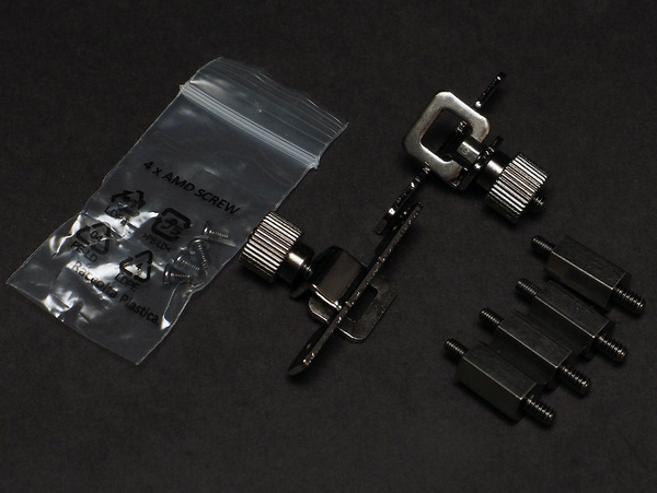 AMD AM5/4については2つの方法がある。ひとつは標準ブラケットを利用する方法。AMD AM5/4マザーボードではおなじみ、ツメ付きの黒いCPUクーラー固定パーツを取り外し、標準バックプレートのネジ穴にAMD CPU用スタンドオフ(4本)を立て、ナット(4つ)で固定する。もうひとつは黒い固定パーツをそのまま利用する方法。標準ブラケットにAMD CPU用の追加パーツを装着(ネジ4つ)することで、AMD CPUにおける標準的なCPUクーラー装着方法であるツメに引っ掛けて固定が可能になる。工数を数えたところこの装着方法がもっとも少ない手間で組み込める。